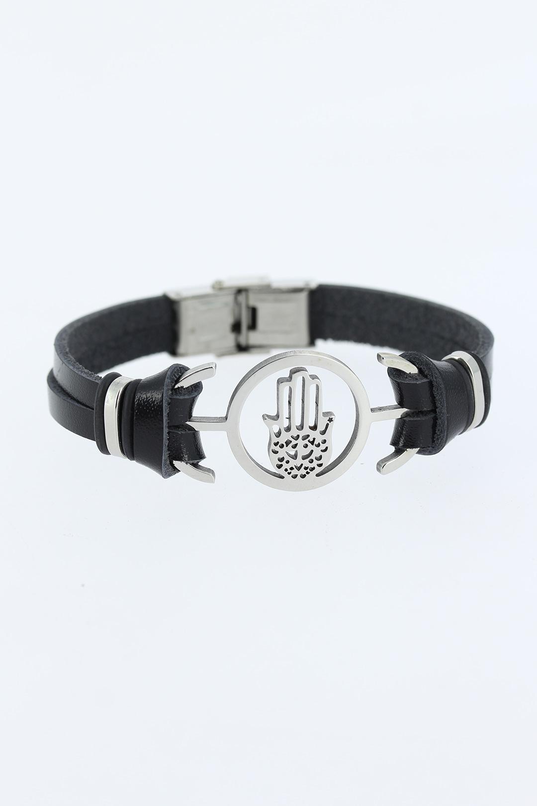 Silver Renk Fatma Ana Eli Figürlü Metal Aksesuarlı Siyah Renk Deri Erkek Bileklik - TJ-EB1356