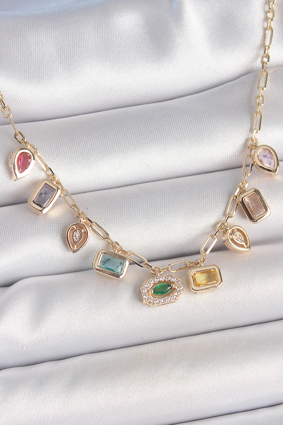 Sıralı Karışık Renk Zirkon Taşlı Gold Pirinç Kolye - TJ-BKO10221
