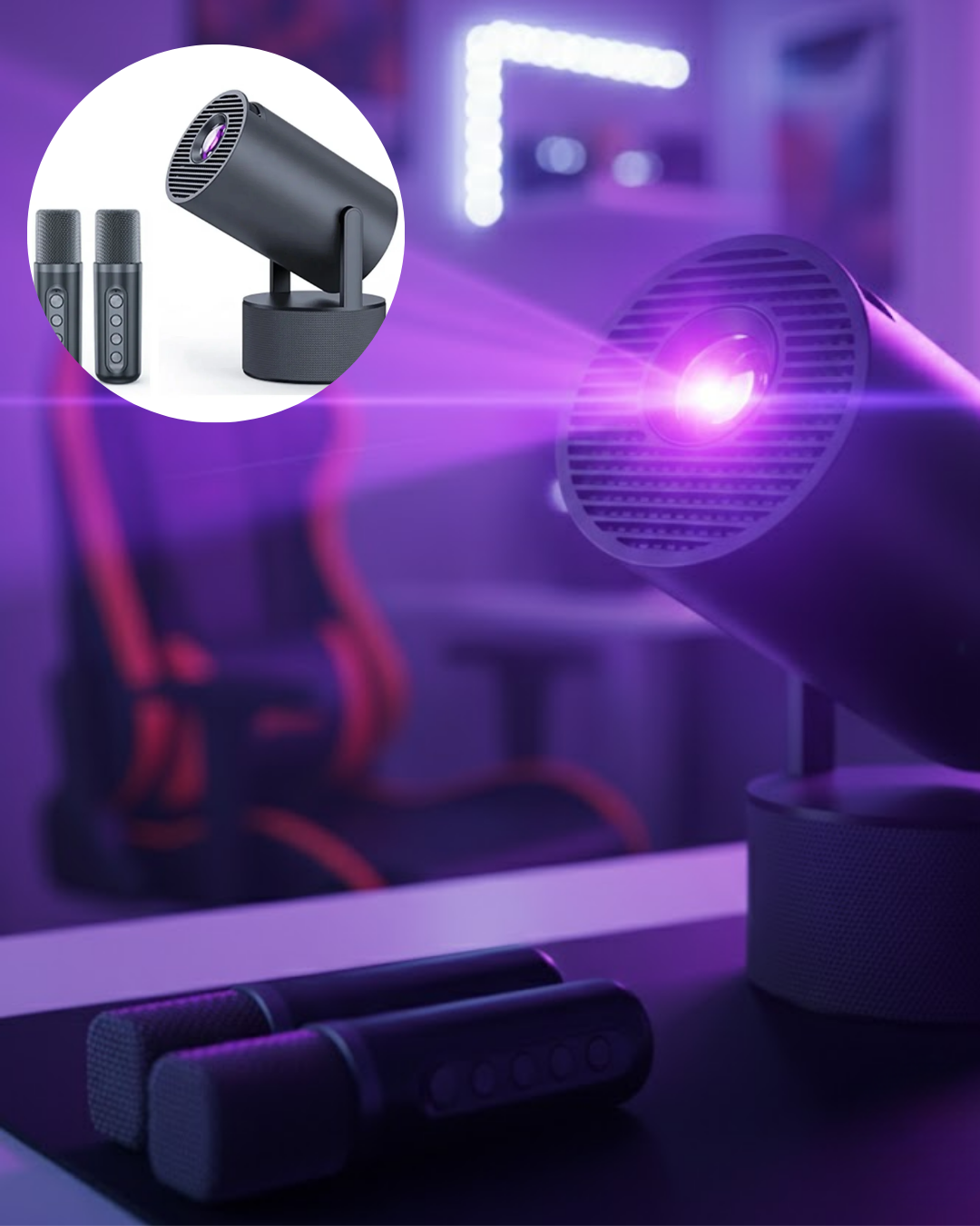 Fişli siyah projeksiyon ve karaoke sistemi, evde sahne atmosferi oluşturmak isteyen kullanıcılar için tasarlanmış çok fonksiyonlu bir eğlence cihazıdır. Standart projeksiyon cihazlarından farklı olarak yalnızca görüntü sunmaz; aynı zamanda çift kablosuz mikrofon desteği ile tam kapsamlı bir karaoke deneyimi sağlar.