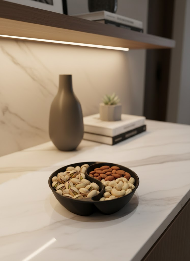 Bölmeli yapısı sayesinde farklı atıştırmalıklar aynı kase içinde düzenli şekilde sunulabilir. Bu özellik, özellikle misafir ağırlarken pratiklik sağlar. Siyah rengi, masa üzerinde sade, modern ve şık bir atmosfer oluşturur.