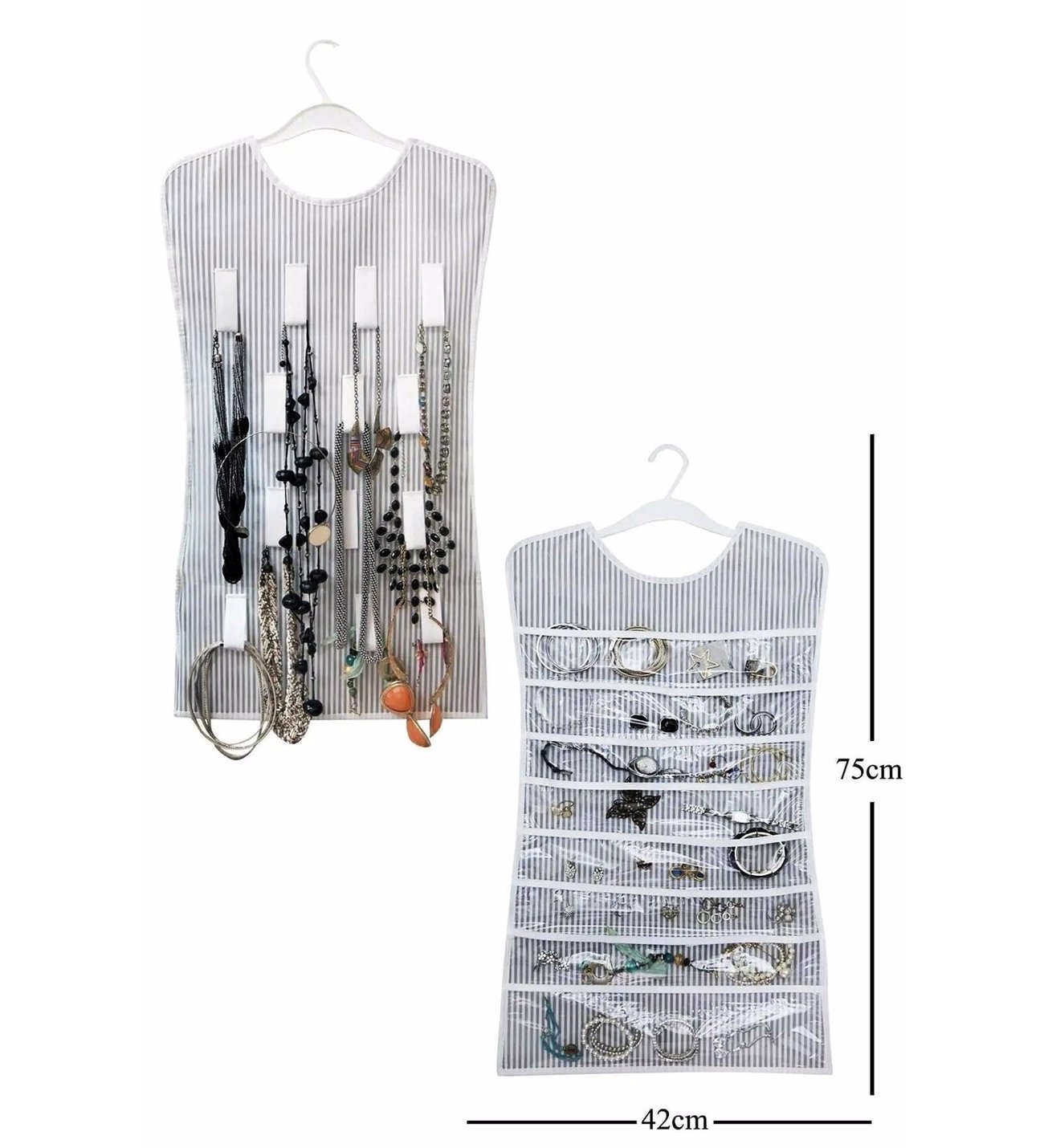 Böylece bir tarafta açık cepler ve diğer asılı döngüler ile kolayca takı koleksiyonunu görebilirsiniz