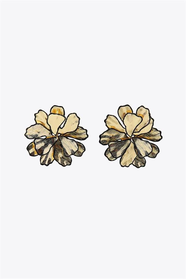 Siyah Detaylı Çiçek Küpe - Altın