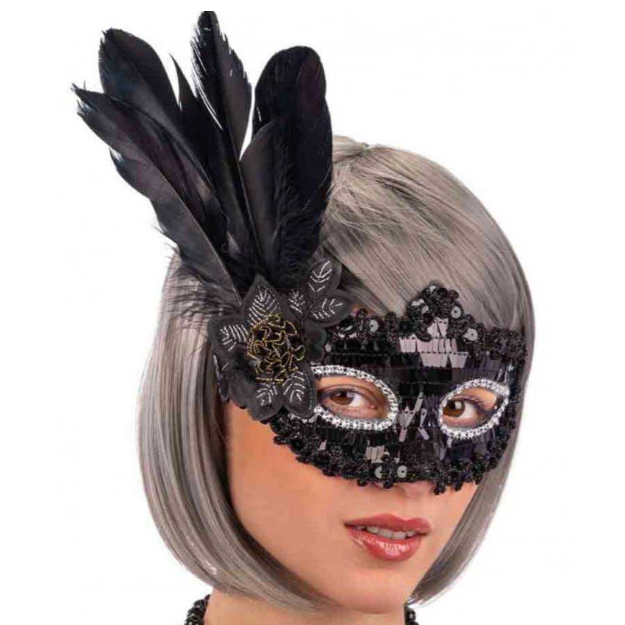 Siyah payetli pullu siyah renk yandan tüylü parti maskemiz: