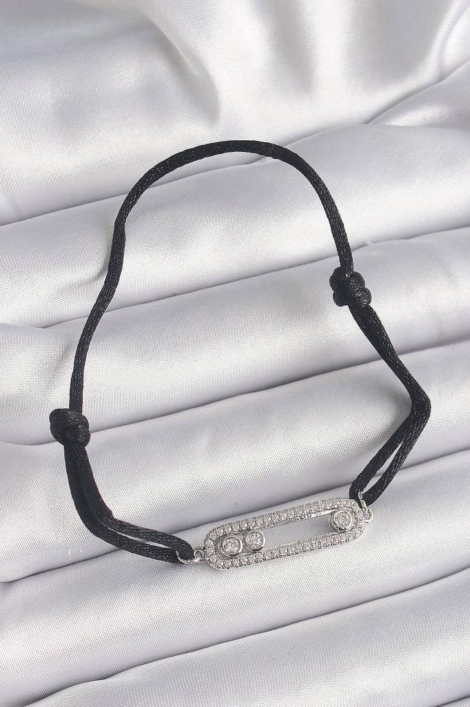 Siyah Renk İpli Asansör Zirkon Taşlı Gümüş Messika Model Kadın Bileklik - TJ-BB6580