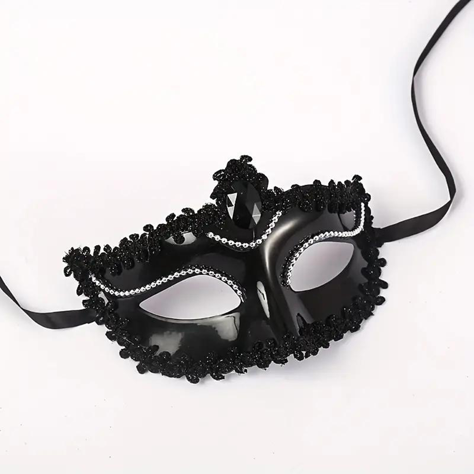 Siyah Renk Kenarları Dantelli Taşlı Parti Maskesi Venedik Balo
