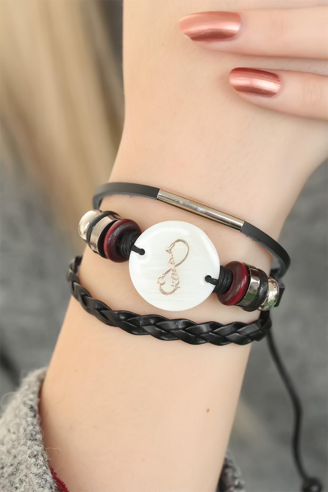 Siyah Renk Sonsuzluk ve Atatürk İmza Tasarım Çoklu Deri Bayan Bileklik - TJ-BB2698-KS