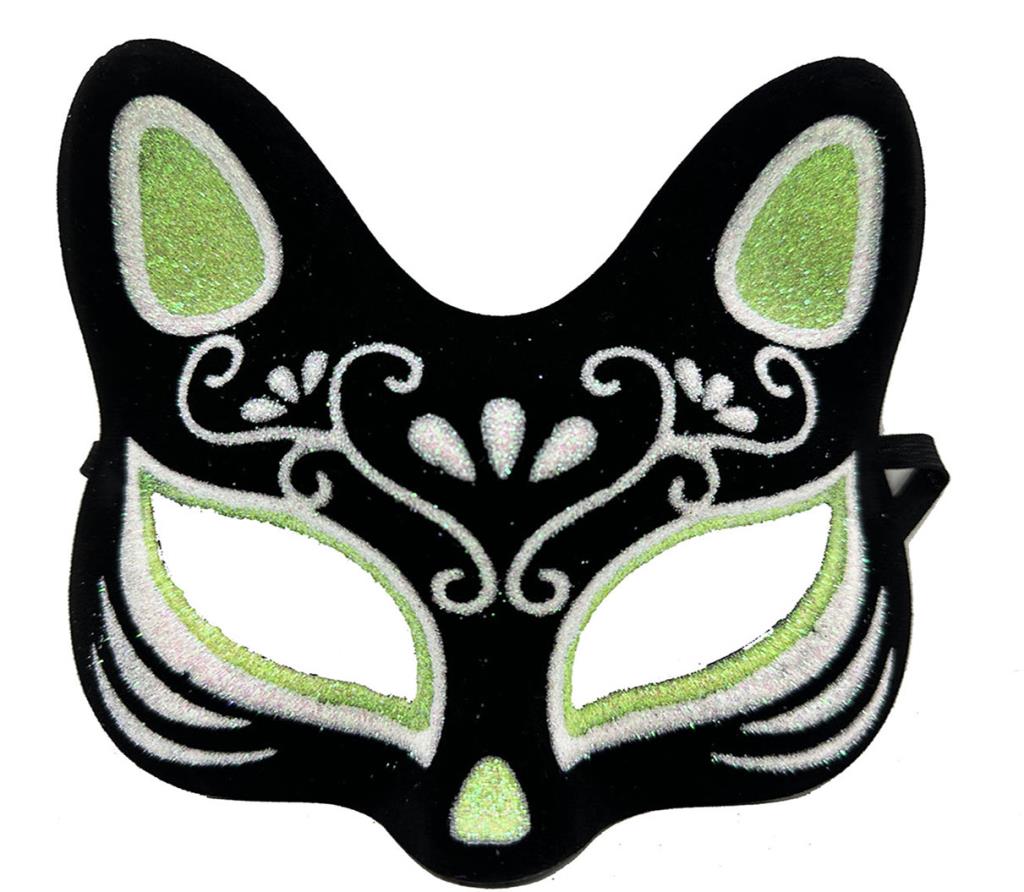 Siyah Renk Süet Kaplama Üzeri Gümüş Yeşil Simli Kedi Maskesi 17x14 cm