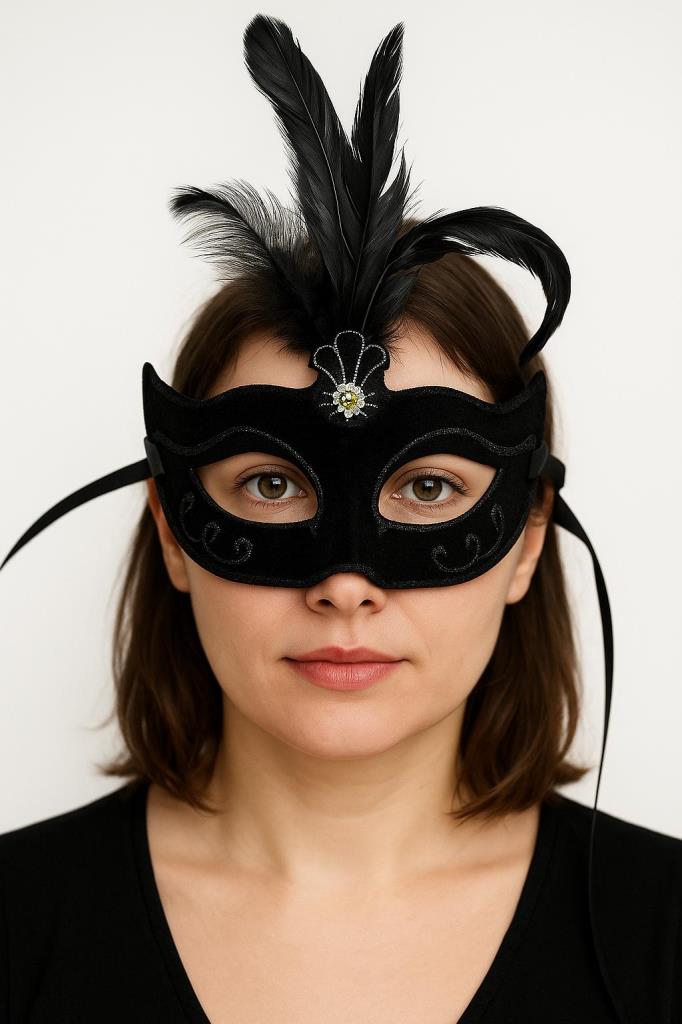 Siyah Renk Tüylü Siyah Süet Kaplama Parti Balo Maskesi, balolar, maskeli partiler veya kostüm partileri gibi özel günlerde gizemli ve karizmatik bir görünüm elde etmek isteyenler için mükemmel bir seçimdir. Siyah süet kaplaması ve yandan sarkan tüyleri ile bu maske sizi partinin en gizemli ve karizmatik konuğu yapacak.