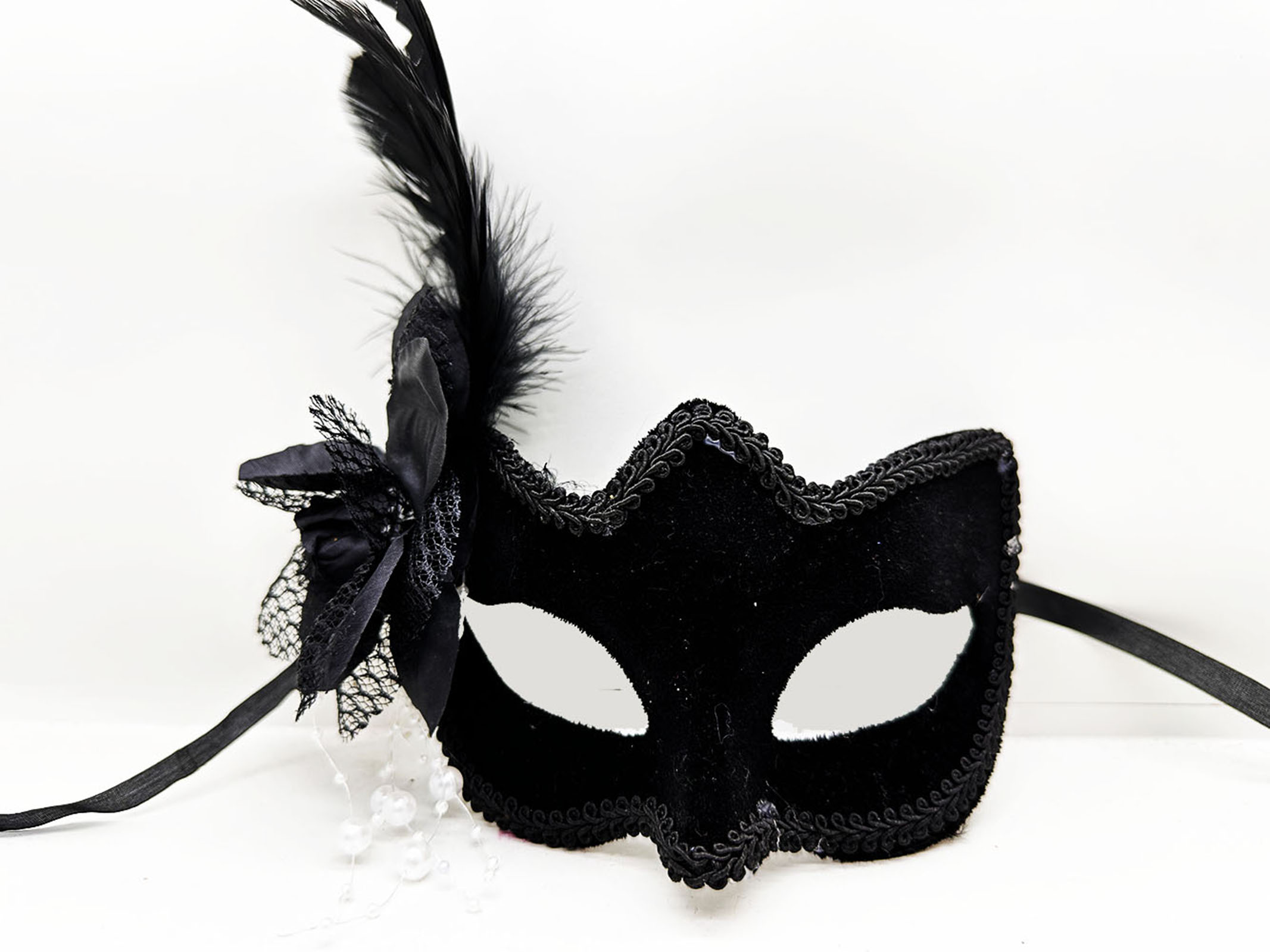 Siyah Renk Süet Kaplama Yandan Tüylü Beyaz İncili Parti Maskesi, balolar, maskeli partiler gibi özel günlerde gizemli ve göz alıcı bir görünüm elde etmek isteyenler için mükemmel bir seçimdir. Yumuşak süet kaplaması ve zarif beyaz incileri ile bu maske sizi partinin yıldızı yapacak.