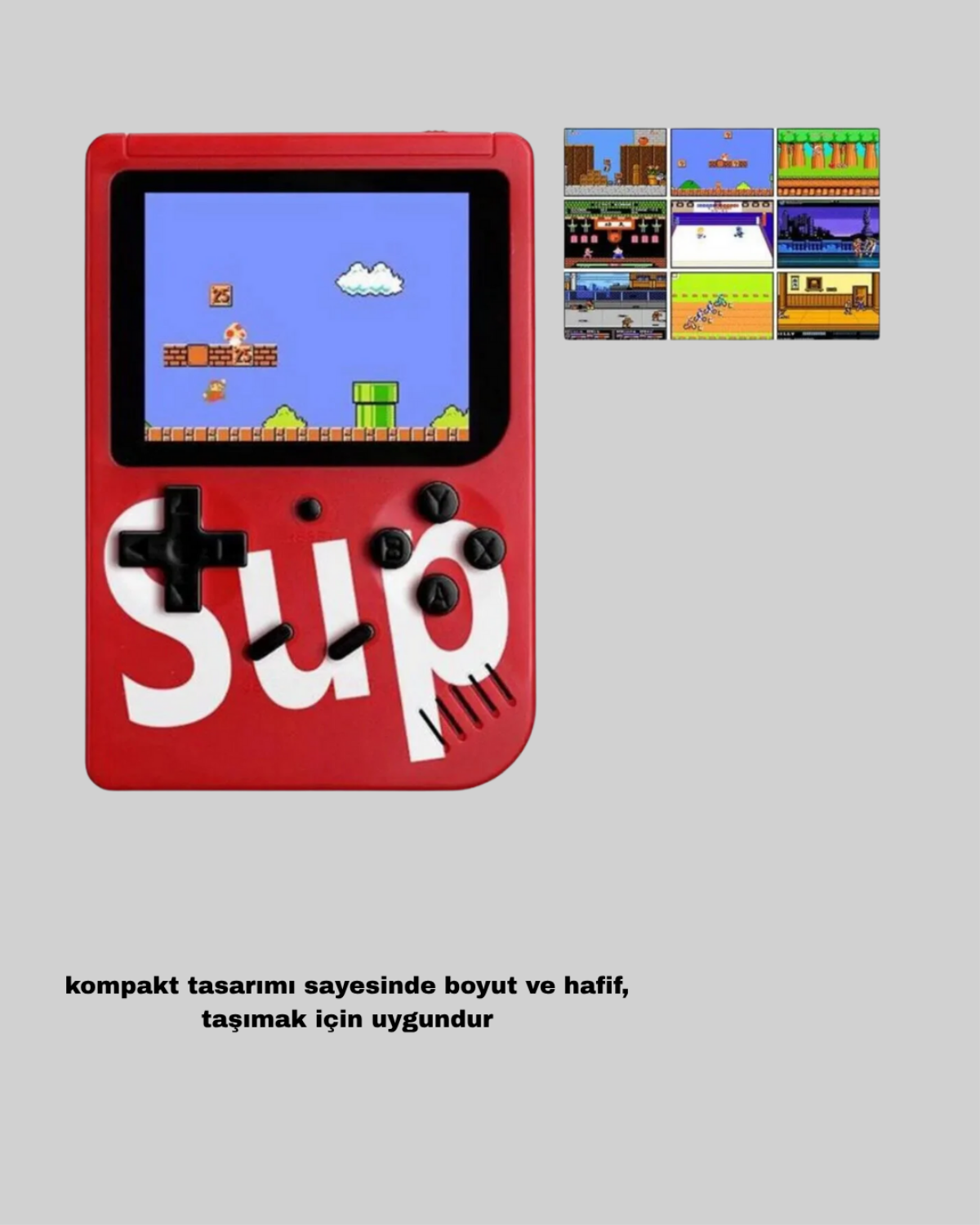 Geçmişin efsanevi oyunlarını yanınızda taşıyın! SUP Retro El Konsolu, tam 500 klasik oyun seçeneğiyle nostaljiyi yeniden yaşamanız için tasarlandı. Platform, yarış, dövüş, bulmaca ve spor gibi birbirinden eğlenceli oyun türlerini tek bir cihazda buluşturur. Kutudan çıkan ikinci oyun kolu sayesinde çift kişilik oyun keyfi yaşamak mümkündür. Arkadaşlarınızla birlikte nostaljik atari deneyimini paylaşarak unutulmaz anlar yaşayabilirsiniz. 3 inç renkli ekran, canlı görüntü kalitesiyle oyunları keyifli hale getirir. USB bağlantı kablosu sayesinde televizyona veya bilgisayara bağlanabilir, oyunları büyük ekranda oynayabilirsiniz. 700 mAh şarj edilebilir Li-ion bataryası, 5 saate kadar kesintisiz oyun süresi sunar. Şarj işlemi kolaydır ve elektrikle doldurulabilir. 110 gram ağırlığındaki kompakt tasarımı, her yere kolayca taşınmasını sağlar. Seyahatlerde, yolculuklarda veya evde rahatlıkla kullanabilirsiniz. Kutunun içeriğinde; el konsolu, şarj kablosu, AV bağlantı kablosu ve 2. oyun kolu yer alır. Hem çocuklar hem yetişkinler için mükemmel bir hediye olan SUP Retro Game Box, klasik oyun kültürünü modern taşınabilirlikle buluşturuyor!