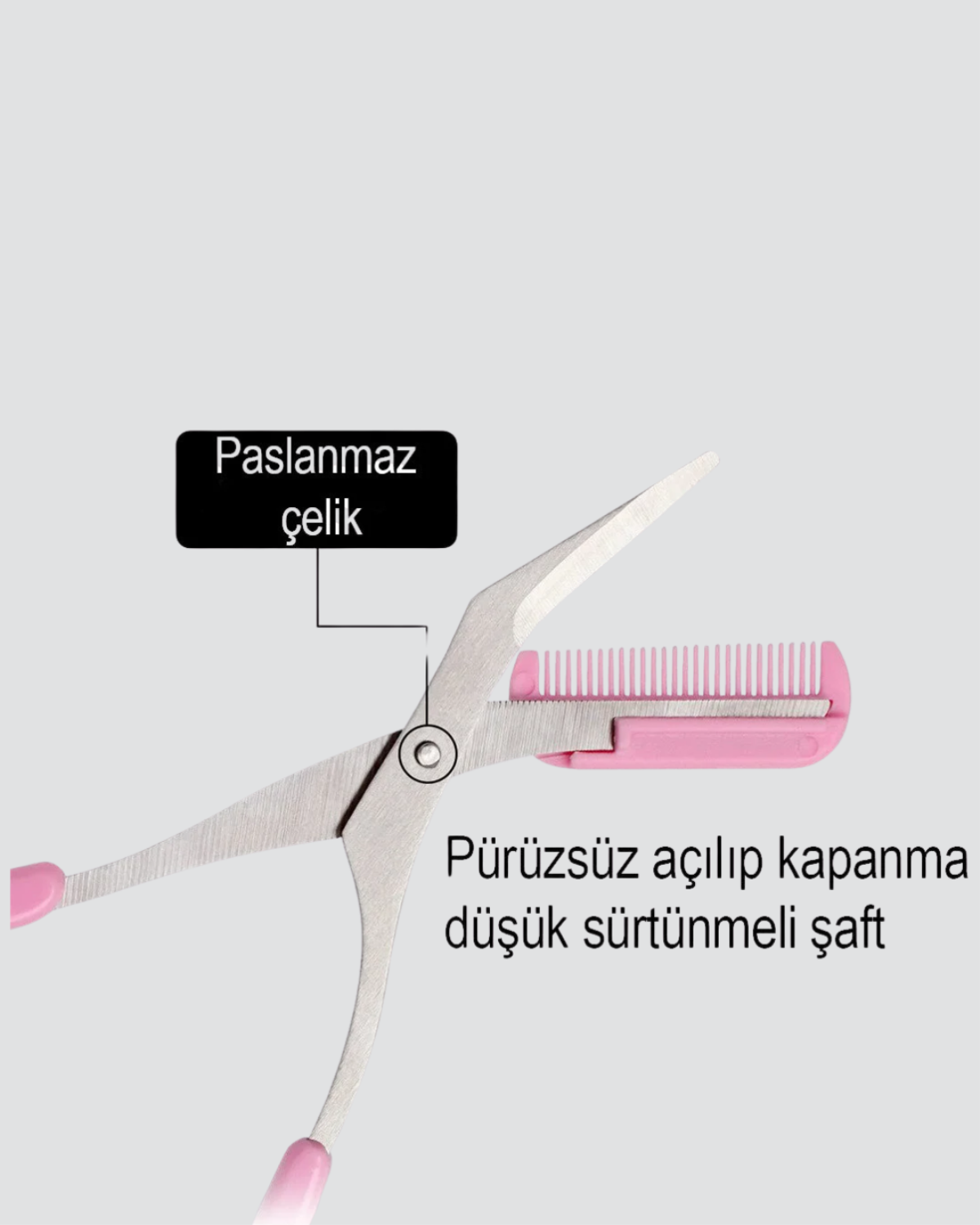 Göz alıcı kaşlara sahip olmanın en kolay yolu!Taraklı Kaş Düzeltme Makası, kaşlarınızı profesyonel düzeyde şekillendirmenize yardımcı olur. Ergonomik sap tasarımı sayesinde elinizde rahatça kavranır ve titremeden, hassas hareketlerle kesim yapmanızı sağlar. Keskin bıçakları, en ince tüyleri bile kolayca keser.Taraklı başlığı, kaşlarınızı düzgünce tarayarak simetrik bir kesim sağlar. Böylece kaşlarınızı kısaltırken yanlış kesim riskini ortadan kaldırır. Bu mini kaş makası, hem evde kişisel bakım için hem de profesyonel güzellik merkezlerinde kullanıma uygundur.Taşınabilir boyutu sayesinde makyaj çantanızda, seyahat valizinizde veya günlük bakım setinizde rahatlıkla yer alır. Paslanmaz çelik bıçakları, uzun ömürlü ve hijyenik kullanım sağlar.Kaşlarınıza doğal bir görünüm kazandırırken, gereksiz tüyleri hızlıca temizler. Mükemmel bir görünüm için tasarlanan bu makas, günlük bakım rutininizin vazgeçilmez parçası olacak.Her kullanımda net, pürüzsüz ve dengeli bir kaş şekli elde edin! Paket İçeriği:• 1 Adet Taraklı Kaş Düzeltme Makası Bu ürünle artık kaş şekillendirme profesyonel bir deneyime dönüşüyor — kolay, pratik ve etkili!