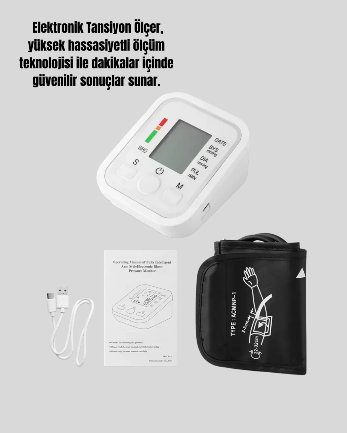Paket içeriğinde tansiyon ölçüm bandajı, kullanım kılavuzu ve monitör bulunmaktadır. 18x12x12 cm boyutları ve yalnızca 300 gram ağırlığı ile taşınabilir, kompakt bir yapıya sahiptir. Evde, işte veya seyahatte yanınızda kolaylıkla taşıyabileceğiniz bu cihaz, sağlık takibiniz için güvenilir bir yardımcıdır.