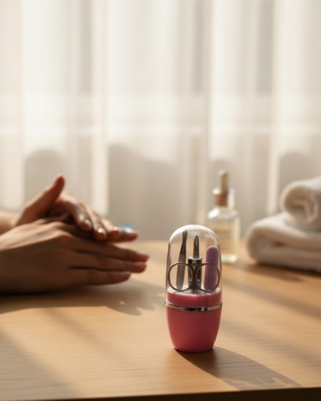 Set içeriğinde yer alan tırnak makası ve manikür-pedikür makası, kontrollü kesim imkânı sağlarken; törpü ve cımbız detaylı bakım için ideal kullanım sunar. Ürünler kapsül içinde düzenli şekilde yerleştirildiği için kaybolma ya da dağılma sorunu yaşanmaz.