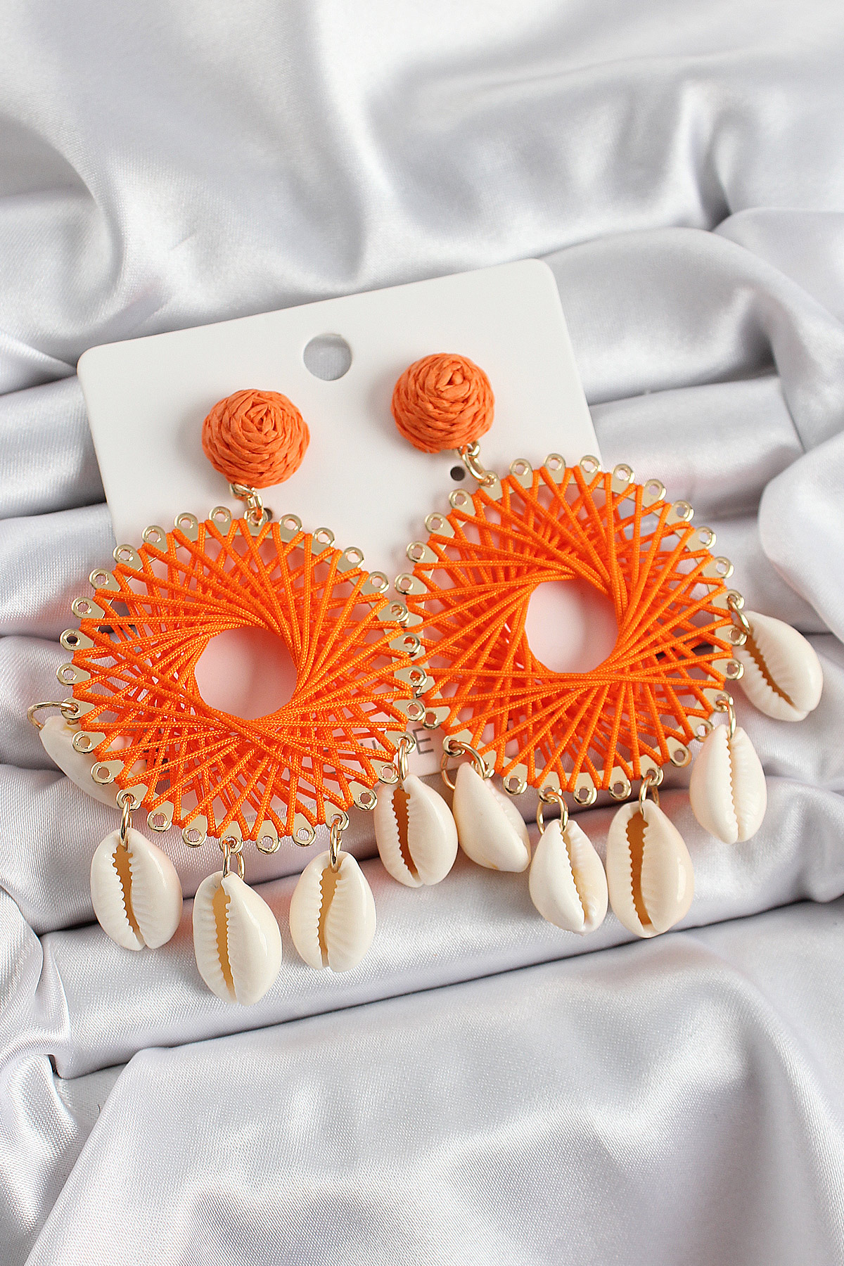 Turuncu Hasır Örgü Sarmal Model Sallantılı Deniz Kabuğu Detaylı Gold Renk Kadın Küpe - TJ-BKP10727