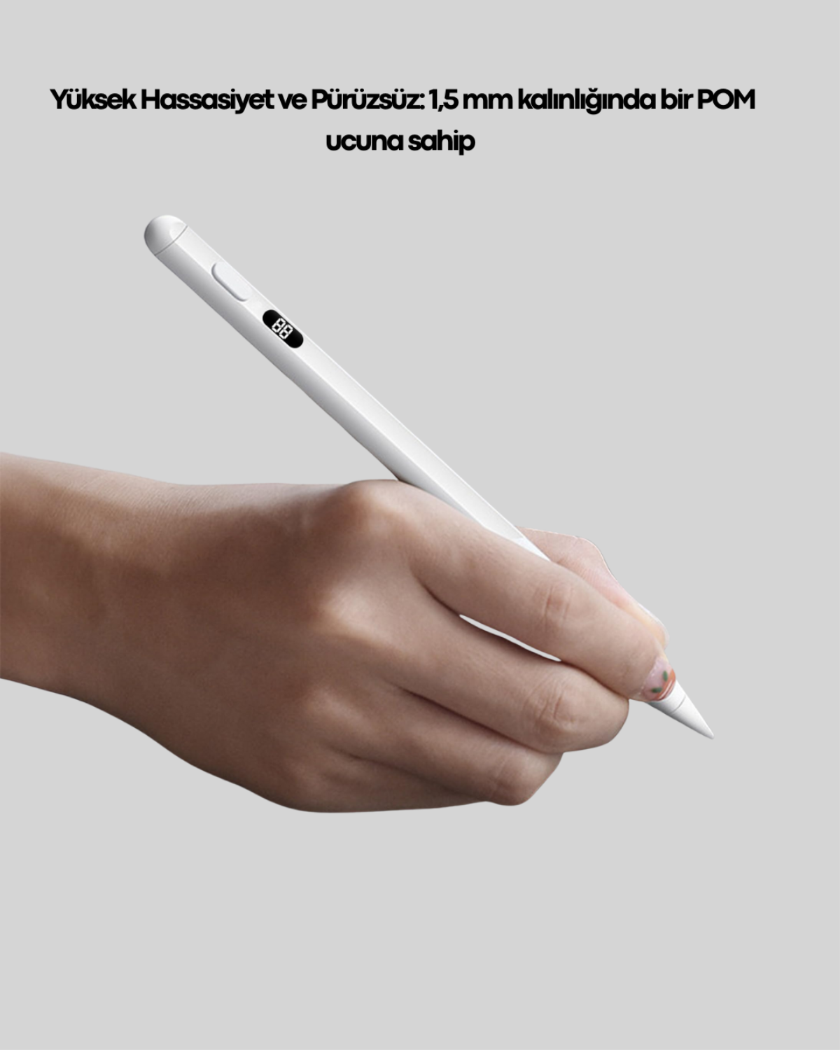 Bu yüksek hassasiyetli iPad kalemi, dijital not alma ve çizim deneyimini gerçek kağıt hissine yaklaştıran 1.5 mm’lik ultra ince POM hassas ucu sayesinde profesyonel kullanım için tasarlanmıştır. Kalemin hassas algılama gücü, çizim, yazı, belge işaretleme veya ders notu tutma gibi işlemleri son derece akıcı hâle getirir. Kağıda kalemle yazıyormuş hissi veren bu stylus pen, özellikle öğrenciler, öğretmenler, grafik tasarımcılar ve iş profesyonelleri için ideal bir seçimdir. Üst kısmındaki tek tuş sayesinde kullanımı son derece kolaydır. Kapasitif kalemin üzerine çift tıklayarak cihazı aktif edebilir, gösterge ışığı ile pil seviyesini görebilirsiniz. Kalem pil seviyesini 4 saniye boyunca ekranda gösterir, ardından otomatik olarak enerji tasarruf moduna geçer. Bu moddayken “--” ışığı görülür ve kalem hâlâ kullanılabilir durumdadır. Pil seviyesini yeniden görüntülemek isterseniz üst düğmeye tek tıklamanız yeterlidir. Stylus kalemin en dikkat çeken özelliklerinden biri, süper hızlı şarjıdır. Type-C kablo ile 35 dakika içinde tam şarj olur ve toplamda 10 saate kadar kesintisiz kullanım sunar. Bu süre, günlük kullanım için fazlasıyla yeterlidir. Uzun derslerde, toplantılarda, çizim oturumlarında veya seyahat sırasında siz daha yorulmadan kalem çalışmaya devam eder. Ayrıca Apple Pen, 5 dakika kullanılmadığında otomatik kapanarak pil tasarrufu sağlar ve batarya ömrünü uzatır. Yazı yazarken gecikme yaşanmaması, çizgilerin kesintisiz akması ve pürüzsüz ekran etkileşimi sunması bu kalemi rakiplerinden ayıran en güçlü özelliklerdendir. Hem hafif hem de ergonomik tasarımı sayesinde uzun süre elde tutulduğunda bile bilek yormaz. Bu stylus kalem, iPad üzerinde profesyonel, hızlı ve pürüzsüz bir yazım deneyimi isteyen herkes için mükemmel bir seçimdir.