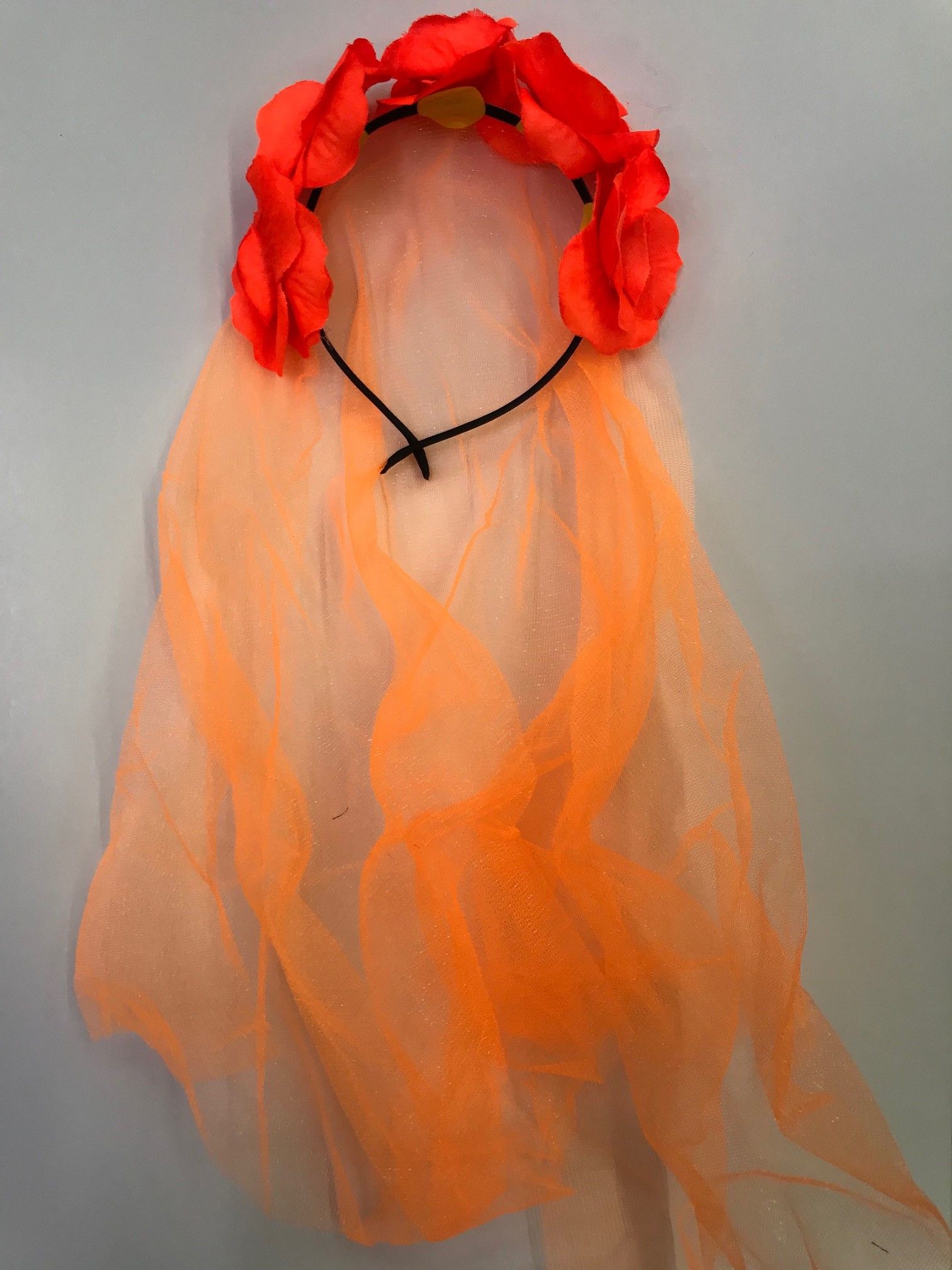 Uzun Duvaklı Üstü Turuncu Çiçekli Parti Tacı