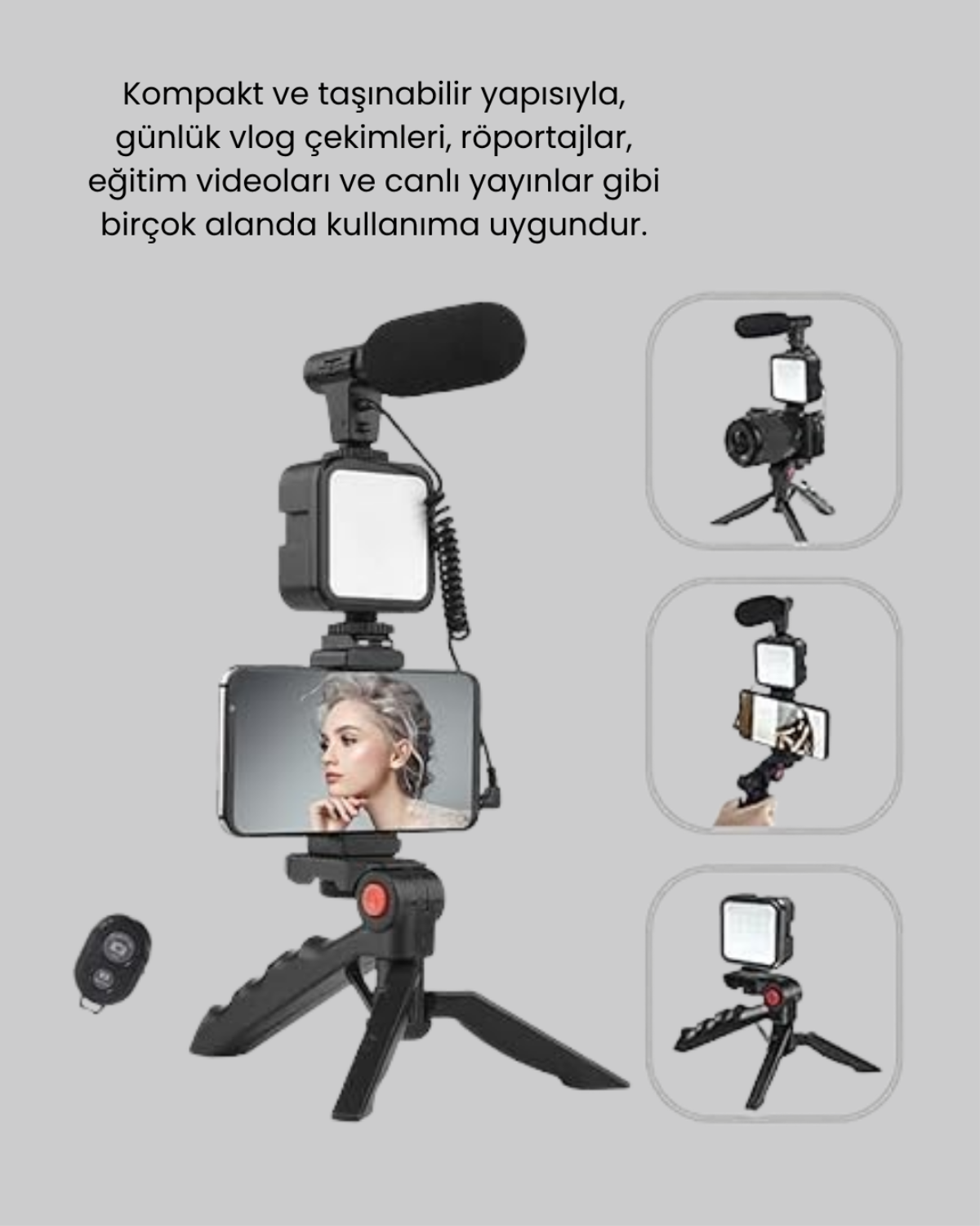 Bu profesyonel video çekim kiti, hem yeni başlayan içerik üreticilerine hem de profesyonel çekim yapanlara kapsamlı çözümler sunmak için özel olarak tasarlanmıştır. Kompakt ve taşınabilir yapısı sayesinde günlük vlog çekimlerinden röportajlara, eğitim videolarından canlı yayınlara kadar geniş bir kullanım alanı sunar. Setin içerisinde mini tripod, LED ışık, harici mikrofon ve Bluetooth uzaktan kumanda gibi temel bileşenler bulunur. Bu özellikler, çekim sürecini hem daha pratik hem de daha kaliteli hale getirir.