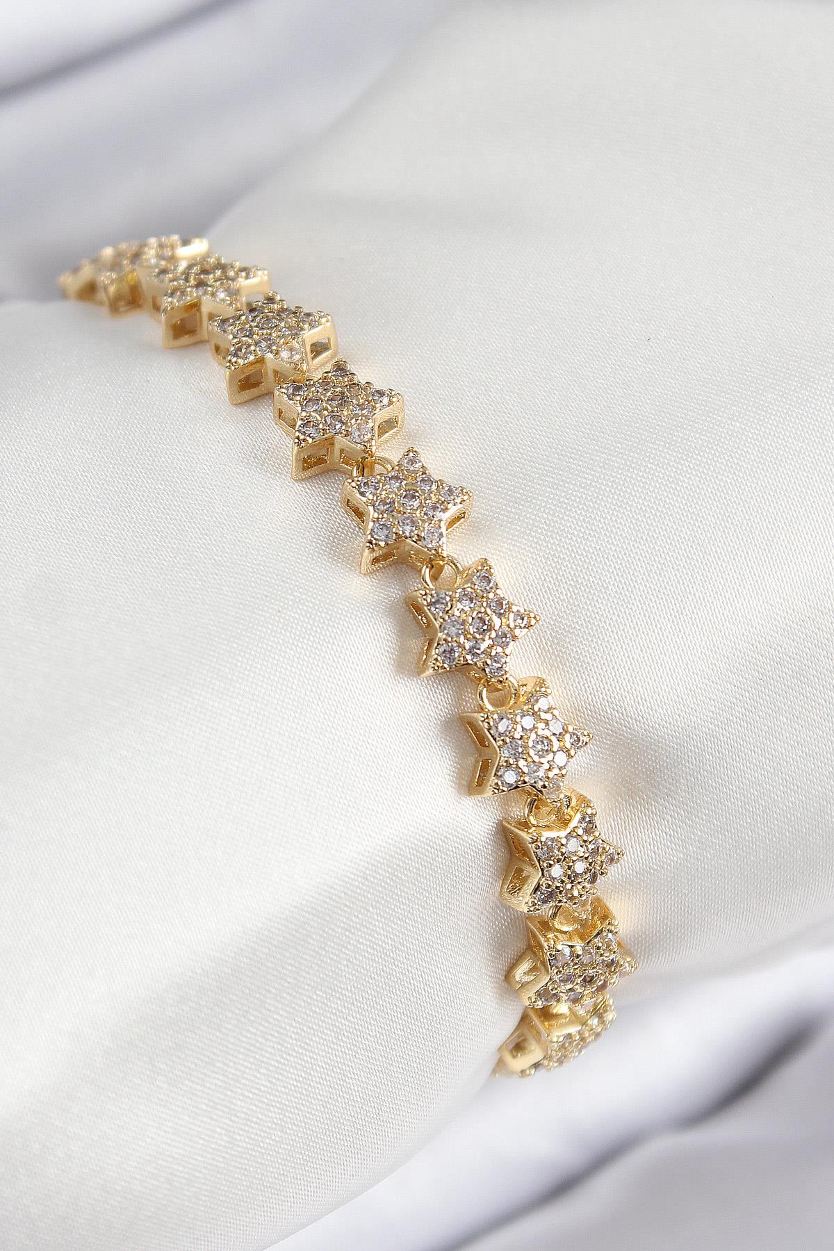 VIP Seri Pirinç Zirkon Taşlı Sıralı Yıldız Model Gold Renk Kadın Bileklik - BB7697