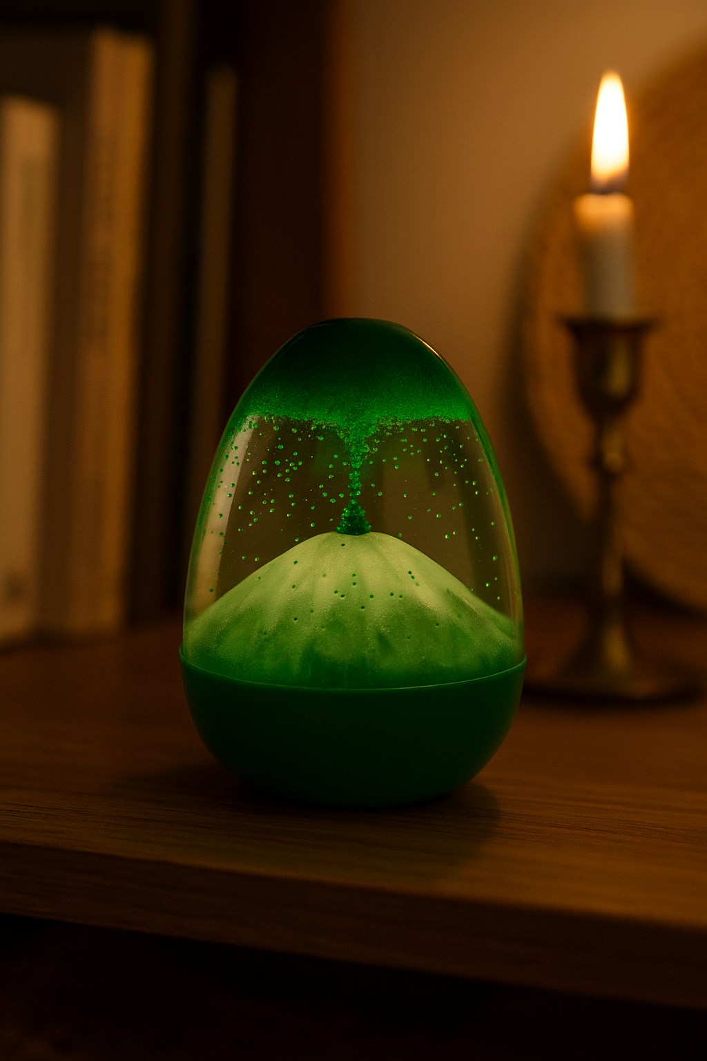 Mavi renkte tasarlanmış bu volkan efektli sıvı kum saati, modern tasarımı ve büyüleyici görselliğiyle hem dekoratif obje hem de giderici masa aksesuarıdır. Şeffaf kubbe içinde yükselen sıvı ve akışkan kum, volkan patlamasını andıran eşsiz bir görsel şölen sunar.