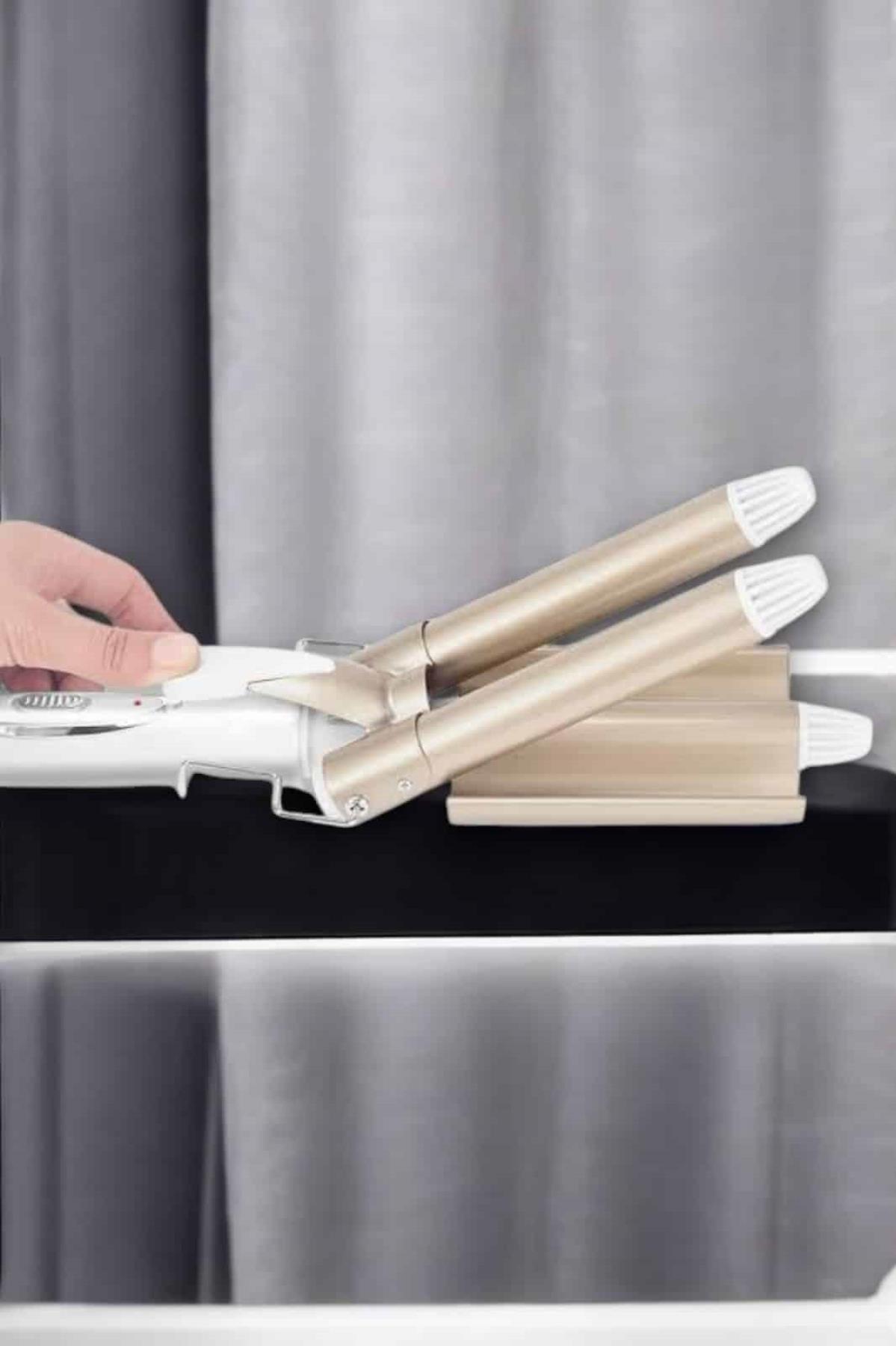 Seramik kaplama teknolojisiyle üretilen bu saç maşası, saçınıza zarar vermeden profesyonel sonuçlar elde etmenize yardımcı olur. Negatif iyon salınımı sayesinde saçtaki elektriklenmeyi azaltır ve doğal parlaklığı korur. 25 mm çapında üç namlulu tasarımı, orta ve uzun saçlarda hacimli ve kalıcı bukleler oluşturur. Hızlı ısınan PTC ısıtma sistemi, 30 saniye içinde 170°C'ye ulaşarak zamandan tasarruf etmenizi sağlar. Ayrıca 220°C'ye kadar ayarlanabilir sıcaklık kontrolü, farklı saç tipleri ve şekillendirme ihtiyaçlarına uygunluk sunar. Kaymaz tutamaç, ısı yalıtımlı ön braket ve haşlanma önleyici üst tasarımıyla güvenli ve pratik bir kullanım deneyimi sağlar. Altın rengi modern tasarımı ile şıklık ve işlevselliği bir arada sunar.