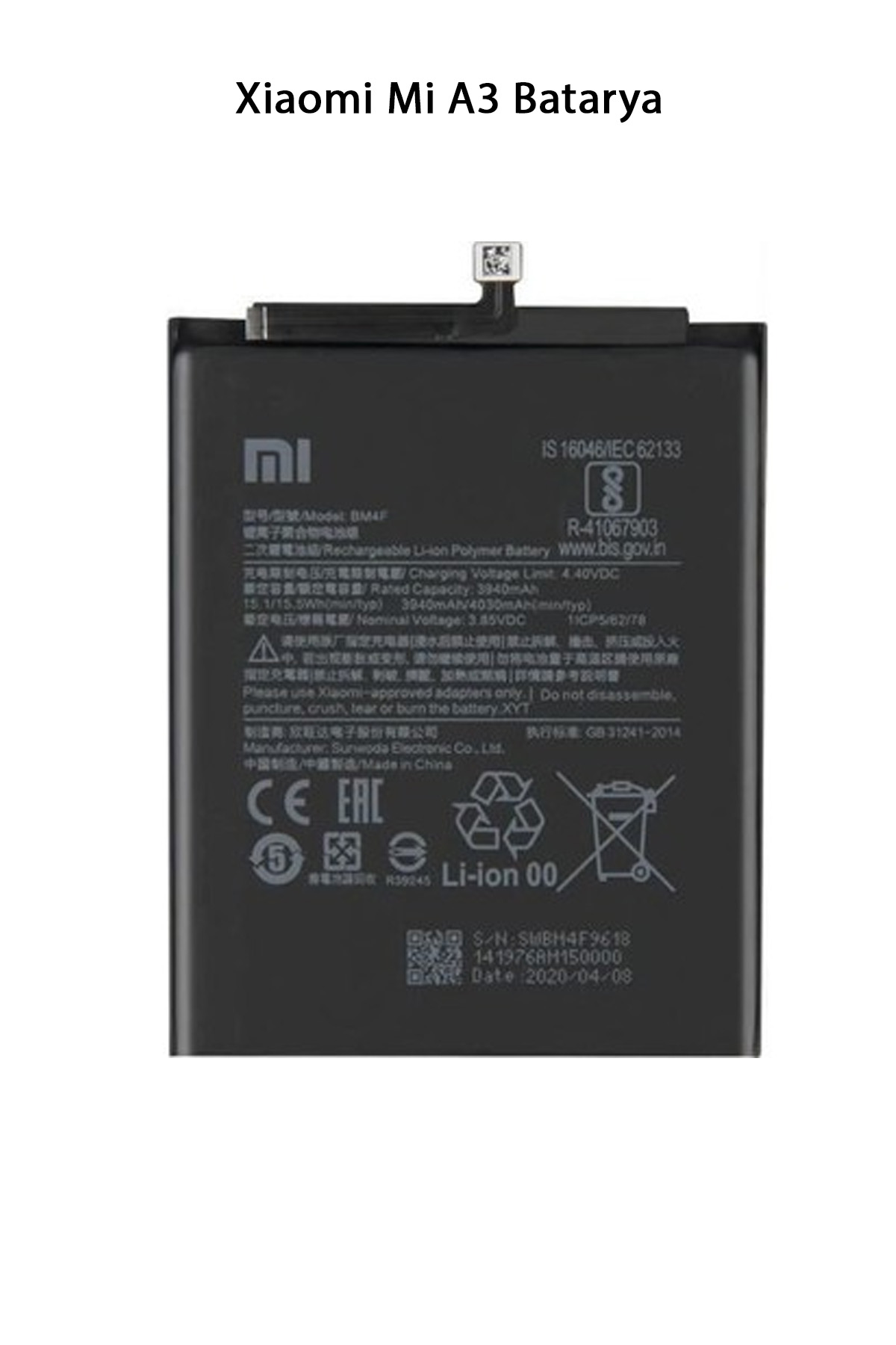 | Xiaomi Mi A3, 4030mAh kapasiteli bir Li-Po batarya ile donatılmıştır. Paket İçeriği : 1 Adet Xiaomi Mi A3 Batarya |
