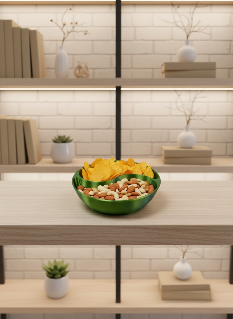 Bölmeli yapısı sayesinde farklı atıştırmalıklar aynı kase içinde düzenli şekilde sunulabilir. Bu özellik, özellikle misafir ağırlarken pratiklik sağlar. Yeşil rengi, masa üzerinde doğal ve ferah bir görünüm oluşturur.
