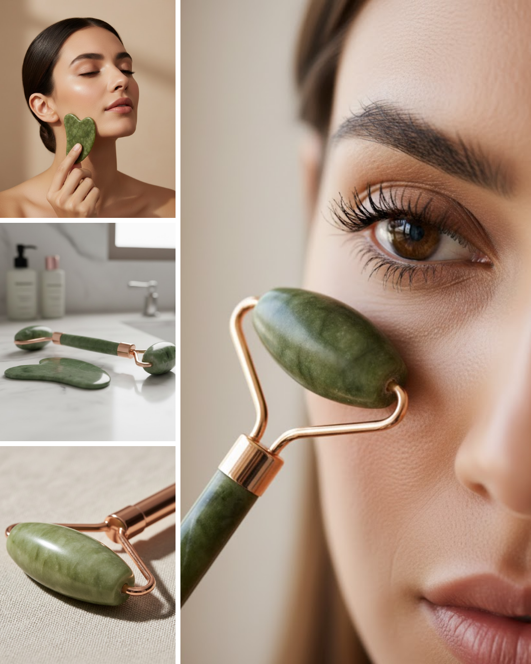 Doğal yeşim taşı roller ve gua sha seti, cilt bakım rutinine estetik ve işlevsel bir dokunuş katar. Dayanıklı yapısı ve doğal taş tasarımı ile uzun süreli kullanım sunar.