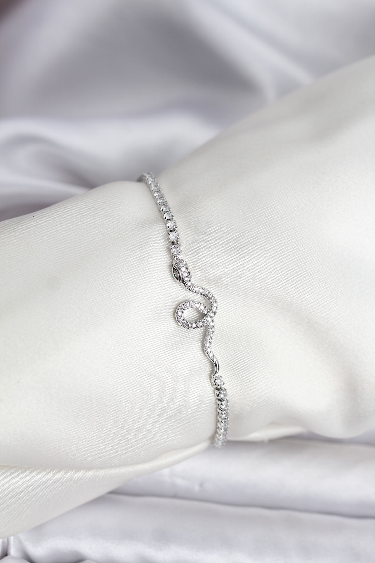Yılan Model Zirkon Taşlı Gümüş Renk Pirinç Su Yolu Kadın Bileklik - TJ-BB8105