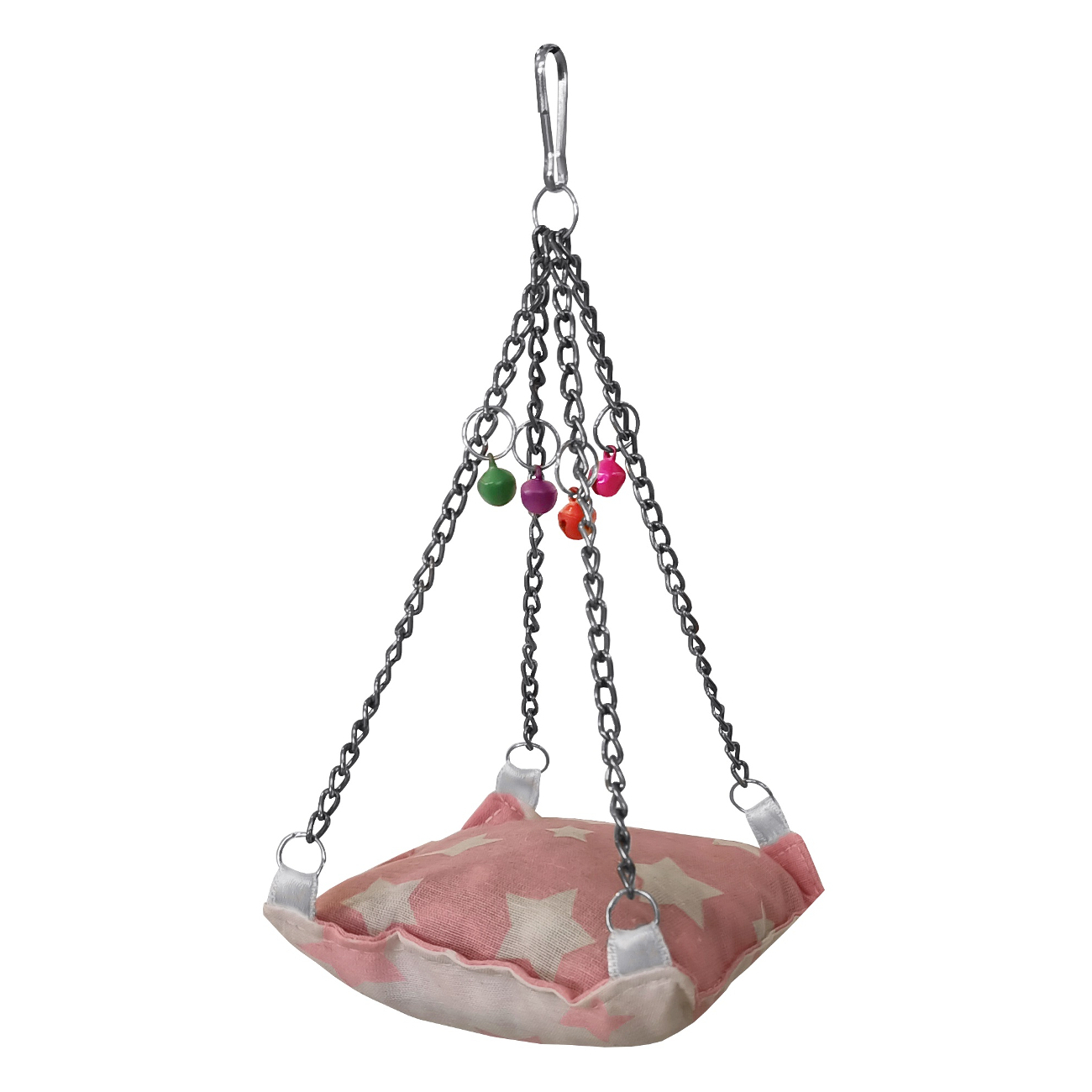 Çanlı ve minderli kuş salıncağıdır. Salıncağın ortasında askılı minik bir peluş minder bulunmaktadır. Renkli çan ve zincirle hazırlanan askısı ile şık bir görünüme sahiptir. Kuşlarınız bu oyuncaklarla hoş bir vakit geçirebilirler. Çanlı kuş salıncağı yıldız desenli minder tasarımı sayesinde kanatlı dostunuz için özel olarak üretilmiştir. Oyuncaklar zihinsel egzersiz oluşturması açısından yararli olup fiziksel egzersize teşvik eder. Farklı oyuncaklar kullanmak kuşun ilgisinin çeker, bu sebeple dönem dönem oyuncak değişikliği yapılması kanatlı dostunuzun sıkılmasını ve bunalıma girmesini önleyecektir.