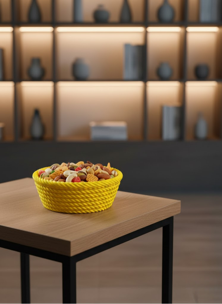 Yuvarlak Çerezlik Sarı 4×12 cm ölçüsü sayesinde küçük alanlarda bile etkili bir sunum alternatifi sunar. Salon sehpaları, masa üstleri ve raf dekorasyonlarında hem dekoratif hem de işlevsel bir kullanım sağlar. Canlı sarı rengi ortama sıcak bir hava katar.