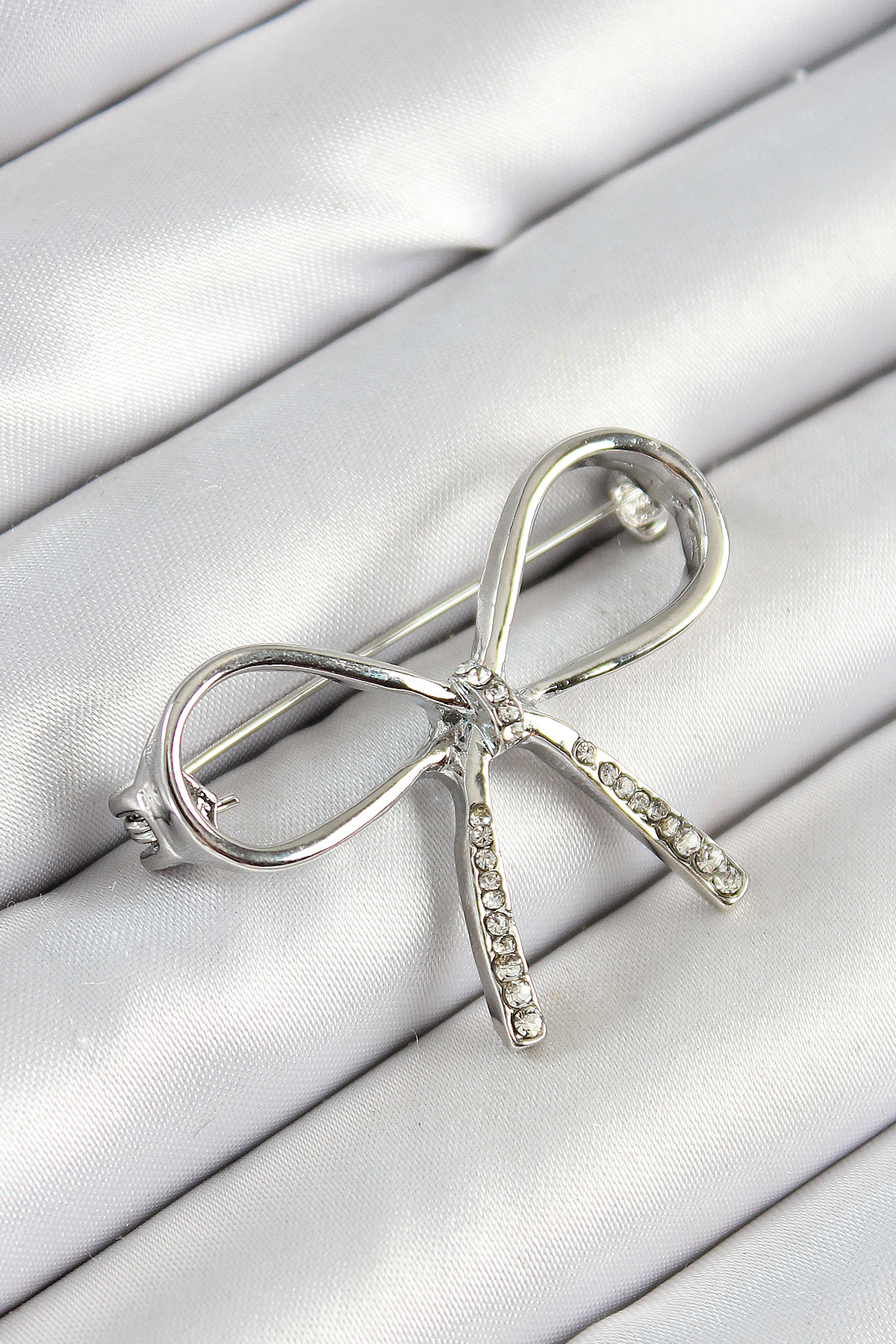 Zirkon Taş Detaylı Fiyonk Figürlü Gümüş Renk Kadın Broş - TJ-BR453