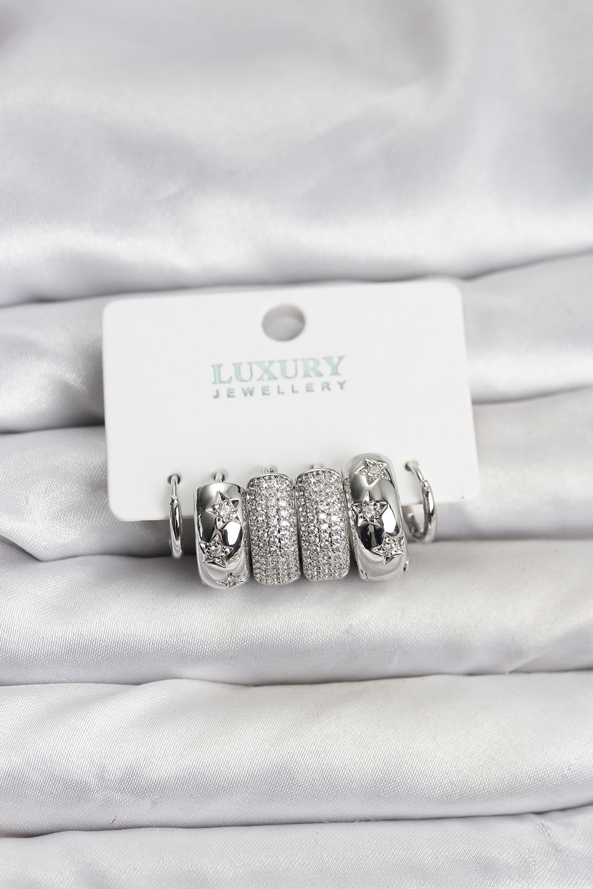 Zirkon Taşlı Pirinç Gümüş Renk Halka Kadın Küpe Seti - TJ-BKP11488